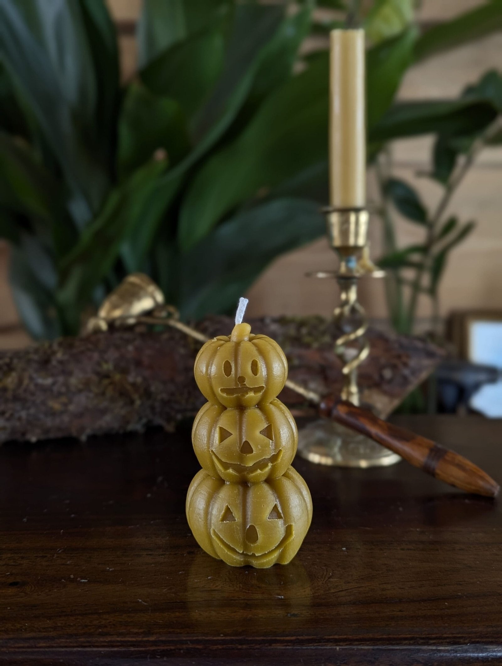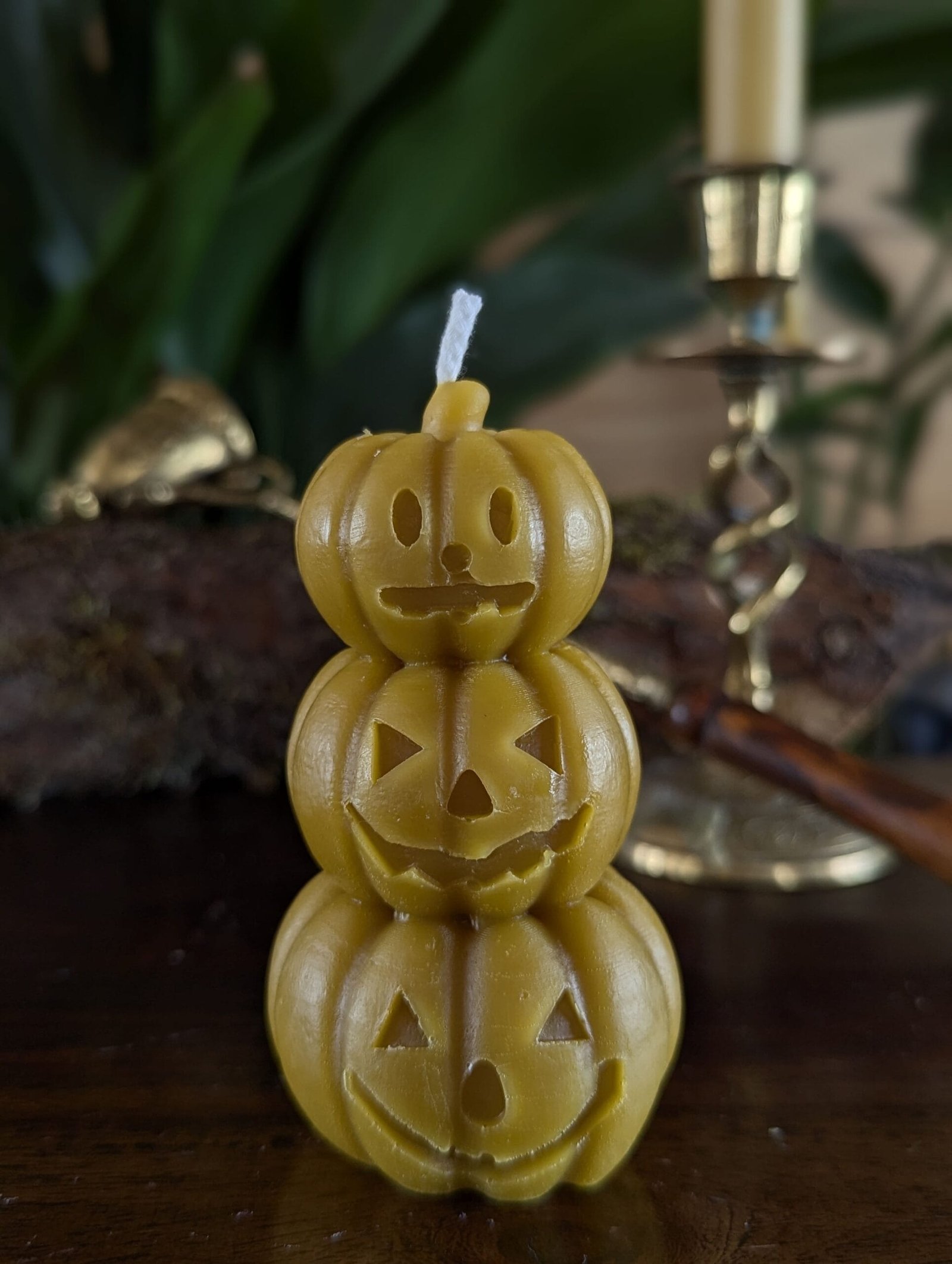 Bičių vaško žvakė „Moliūgai”: Aukštis ~9cm, skersmuo ~4cm, svoris ~110g.